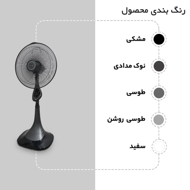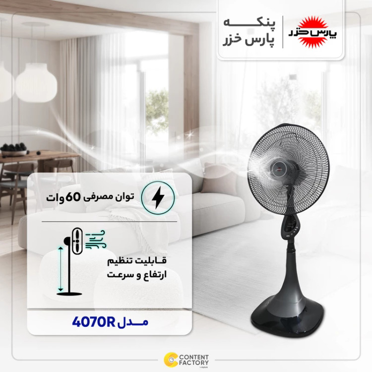 این کالای سرمایشی از برند معتبر پارسی خزر ابعادی به اندازهی ۴۰x۴۰x۱۰ سانتیمتر دارد و با توجه به قدرت پرتاب باد آن میتوان از آن در اتاق خوابهایی با ابعاد زیر 80 متر استفاده کرد. حجم باددهیای که این نوع پنکهی خانگی کم صدا میتواند ارائه دهد چیزی در حدود 56 متر مکعب در دقیقه است. از طرفی چهار پرهی پلاستیکی و ضخیم آن امکان پرتاب باد به شکل قدرتمند به فضا را مهیا میسازند. امکان تغییر سرعت در سه حالت تند، متوسط و کند از دیگر ویژگیهای این کالای کم مصرف و بهصرفه است. وجود کنترل از راه دور یکی از مهمترین فاکتورها به منظور راحتی در استفاده از پنکه است. در کنار آن بهرهمندی از تایمری دقیق هم میتواند مزیتی ارزشمند در یک محصول سرمایشی مانند پنکهی ایستاده باشد. وزن این محصول کم و در حدود 2.2 کیلوگرم است. همچنین بدنهی این کالا از پلاستیک باکیفیت و نشکن ساخته شده است که ثبات بالایی در زمان کار بهویژه در دور تند دارد. محصول پیش رو در طراحی خود از حفاظ حرفهای برای عدم آسیب به کودکان و حیوانات خانگی استفاده کرده است. گیرههایی کاملا محکم بر روی آن نصب است و با وجود فیوز حرارتی در ساختار موتور، نگرانیای از بابت داغ شدن بیش از حد موتور وجود ندارد چرا که در این حالت سیستم به شکل خودکار میتواند خاموش میشود. پنکه پارس خزر مدل 4070R کالایی بیصدا و قدرتمند با حجم باددهی 56 متر مکعب در دقیقه است که از قابلیت تغییر ارتفاع تا 100 متر به همراه تغییر سرعت در سه حالت بهره برده است. این مدل سیستم خانگی برای اتاقهایی با ابعاد زیر 80 متر کاربردی است و حتی در حالتی با دور تند هم از عدم لرزش و ثبات بالایی برخوردار است. پنکهی پیش رو دارای تایمر و کنترل از راه دور است و از منظر نصب و راهاندازی جزو سادهترین و سریعترین مدلها به حساب میآید.