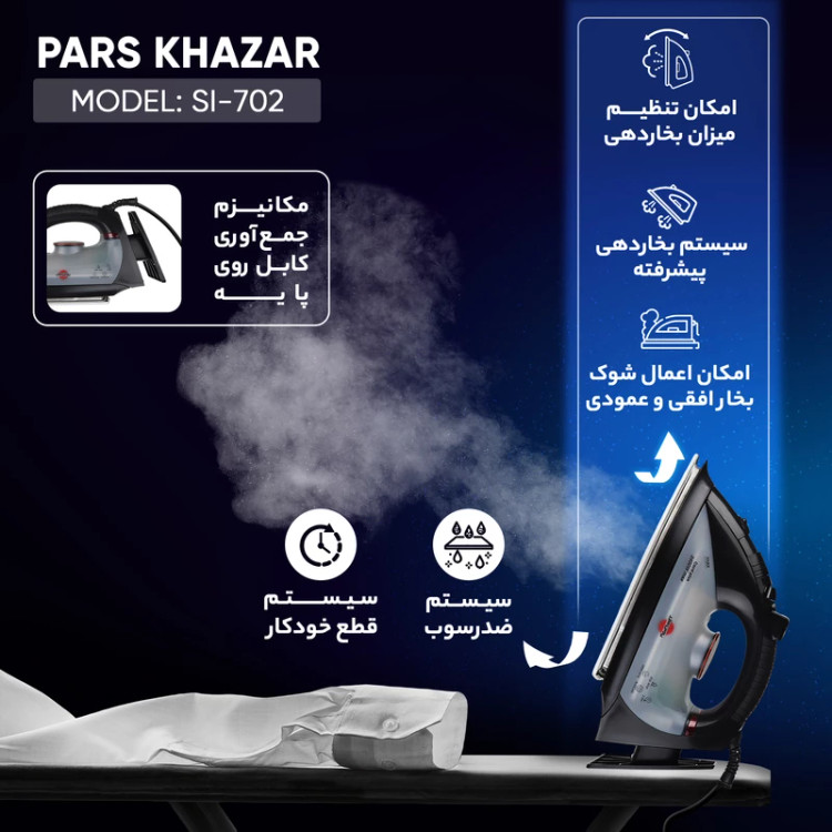 اتو بخار پارس خزر مدل SI-702 اتو بخار پارس خزر مدل SI-702 یک ابزار کاربردی برای اتو کردن لباسها است. این اتو دارای امکانات بخاردهی عمودی است که به شما امکان میدهد لباسها را به راحتی و با دقت بیشتری اتو کنید. همچنین، این اتو دارای ویژگی ضد فرسودگی است که باعث میشود مدت طولانیتری بتوانید از آن استفاده کنید. سیستم ضد رسوب این اتو هم از مزایای دیگر آن است که باعث میشود تا برای شما آسانتر باشد تا از این اتو استفاده کنید و همچنین تا از عمر طولانیتری برخوردار باشد. بهطور کلی، اتو بخار پارس خزر مدل SI-702 یک ابزار حرفهای و کارآمد برای اتو کردن لباسها است که با ویژگیهای خاص خود، تجربه بهتری را برای شما فراهم میکند. این اتو بخار وزن 2500 گرم و ظرفیت مخزن آب 300 میلیلیتر دارد. با حداکثر توان مصرفی 2400 وات و طول کابل 2.1 متر، این محصول توانایی اتوکشی موثر و آسان را دارد. معرفی اتو بخار پارس خزر مدل SI-702 این اتو بخار دارای وزن 2500 گرم است و سیستمهای ضد فرسودگی و ضد رسوب دارد که باعث افزایش عمر مفید و کارایی بالای این محصول میشود. همچنین دارای کفههای استیل با طول کابل 2. 5 متر است که این ویژگیها باعث افزایش عمر مفید و کارایی بالای این محصول میشود. اتو بخار پارس خزر مدل SI-702 دارای امکان بخاردهی عمودی است که از آن میتوان برای اتو کردن لباسهای آویزان استفاده کرد. این ویژگی بسیار منحصر به فرد و کاربردی است و کاربران از آن استفاده زیادی میکنند. این اتو بخار دارای امکاناتی مانند ضد فرسودگی است که باعث افزایش عمر مفید و کارایی بالای این اتو بخار میشود. همچنین این اتو بخار سیستم ضد رسوب دارد که باعث افزایش عمر مفید و کارایی بالای این محصول میشود.